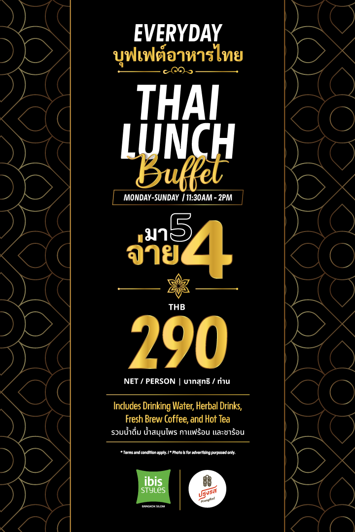 The Thai buffet is available everyday, from 11.30 AM to 2.00 PM. For adults, the price is THB 290 net and for children aged 4 to 12 years, it is THB 145. You can enjoy a wide variety of Thai dishes, all made with fresh ingredients and traditional recipes.